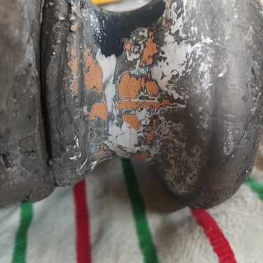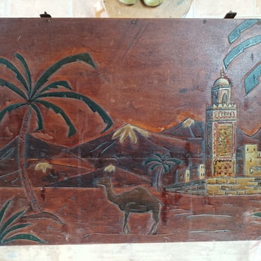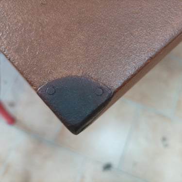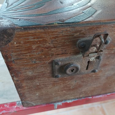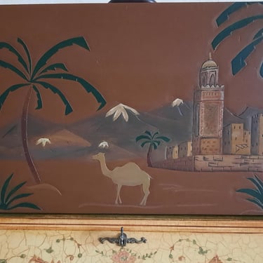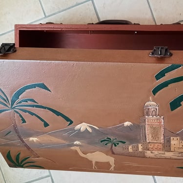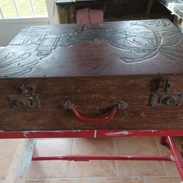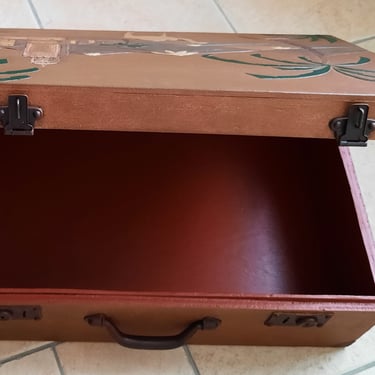 Ancienne valise en bois de style oriental, intégralement restaurée tout en respectant le décor d'origine. En extérieur, application d'un effet faut cuir et d'un effet fausse rouille sur les coins et les quincailleries. En intérieur, réalisation d'un peinture sang de bœuf