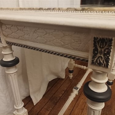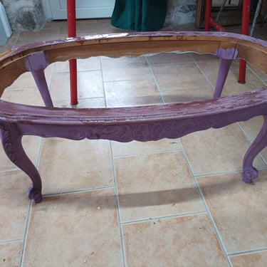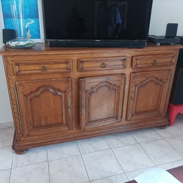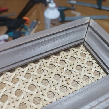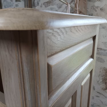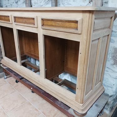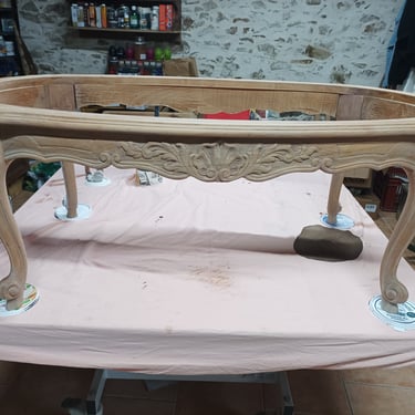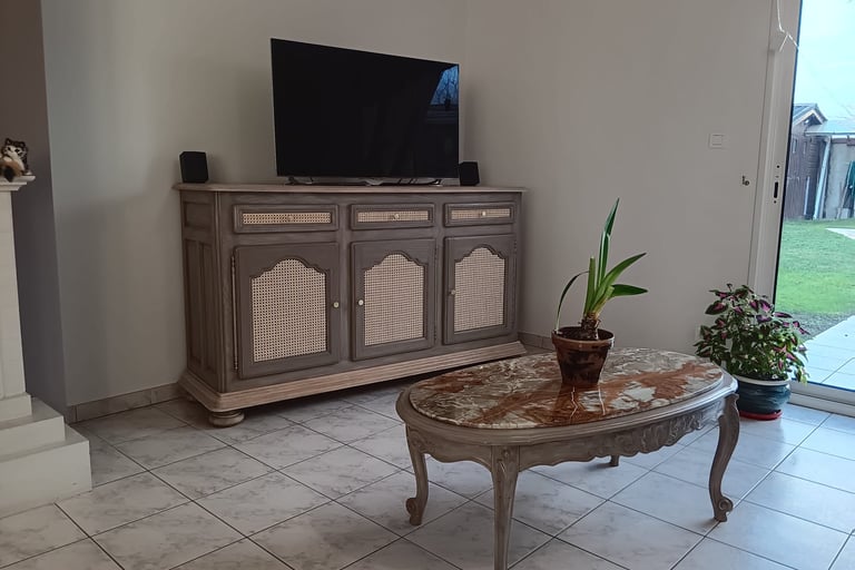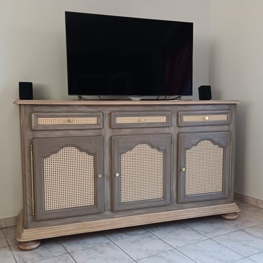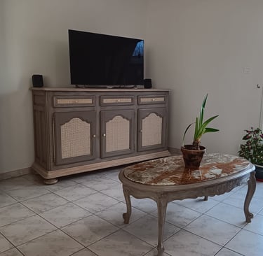 Ensemble de salon incluant enfilade et table régence. Application d'un décor "effet grisé" couleur taupe. L'enfilade a subit une modification des façades des portes et des tiroirs par la pose d'un cannage en rotin. Le plateau et le soubassement ont retrouvé leur couleur chêne brut naturel. Cette transformation apporte une réelle modernité à à ces meubles un peu désuets et leurs donne un style très contemporain.