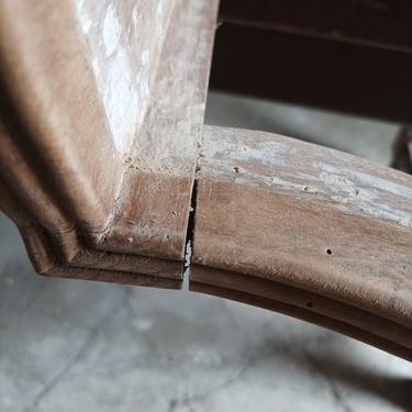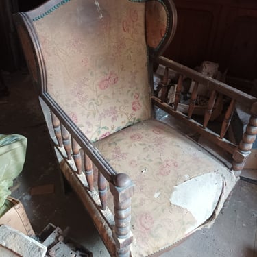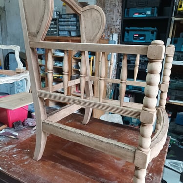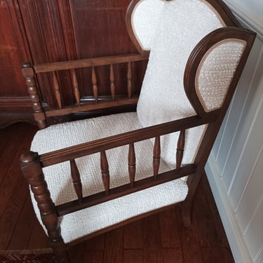 Fauteuil Confessionnal teinté chêne foncé en partenariat avec une tapissière aux méthodes de pose traditionnelle