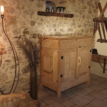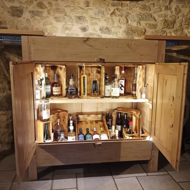 Meuble à sasser ciré revisité en meuble à Apéritif vernis naturel